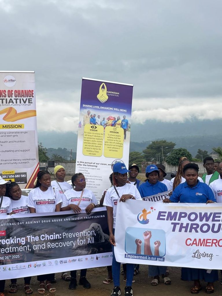 On the 26th of June 2025, Hadassah Foundation workers joined other NGOs in Southwest Region Buea to say #notodrugabuse#. Hadassah Foundation’s primary objective focuses on enhancing wellbeing for all in our community. The use of drugs among youths in Buea and its environs is becoming alarming. While we educate children in schools on the consequences of drug abuse, it is also a brilliant initiative to join the power team of organizers from Mike Yanou Foundation, Lesley Foundation and NKONH HIL TOP ASSOCIATION FOR DEVELOPMENT (NADEV).